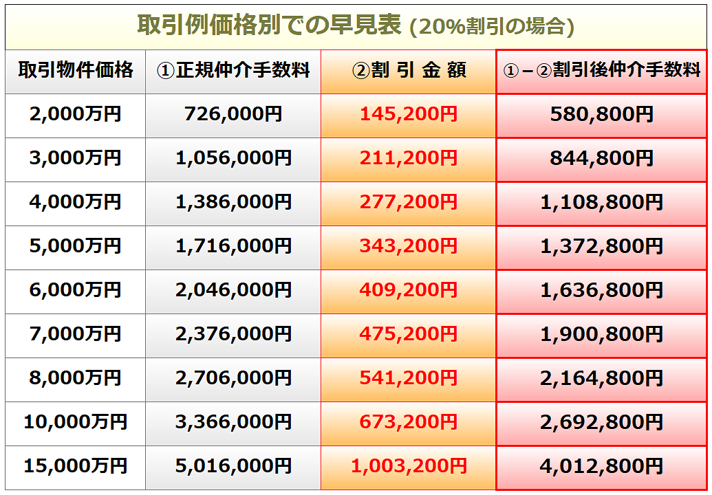 (基本割引率12%)+(8%加算)=仲介手数料値引(適用割引率20%)となります。