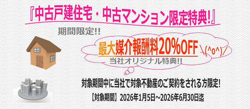 ※1 本特典は当社にて対象である中古戸建住宅・中古マンションをご契約(購入)される方限定となります。仲介手数料割引率最大20% (基本割引率12%)